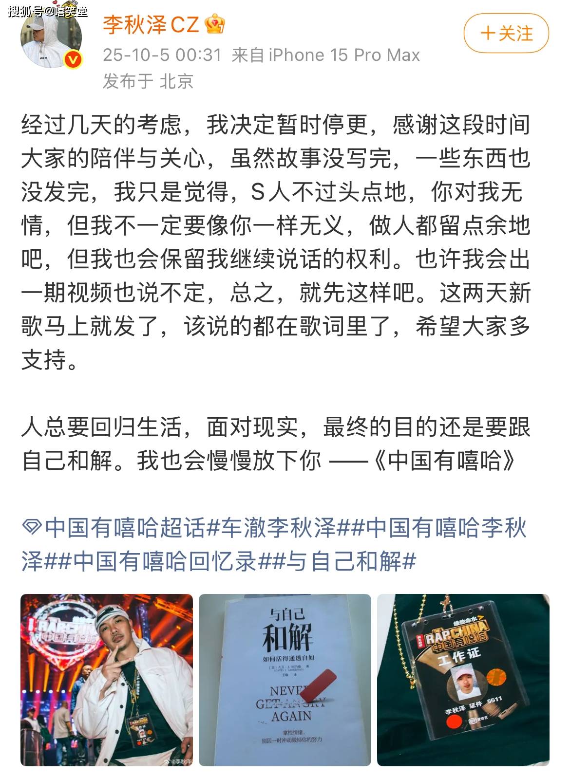 说唱OG李秋泽公开发文,讲述了他停更的原因。