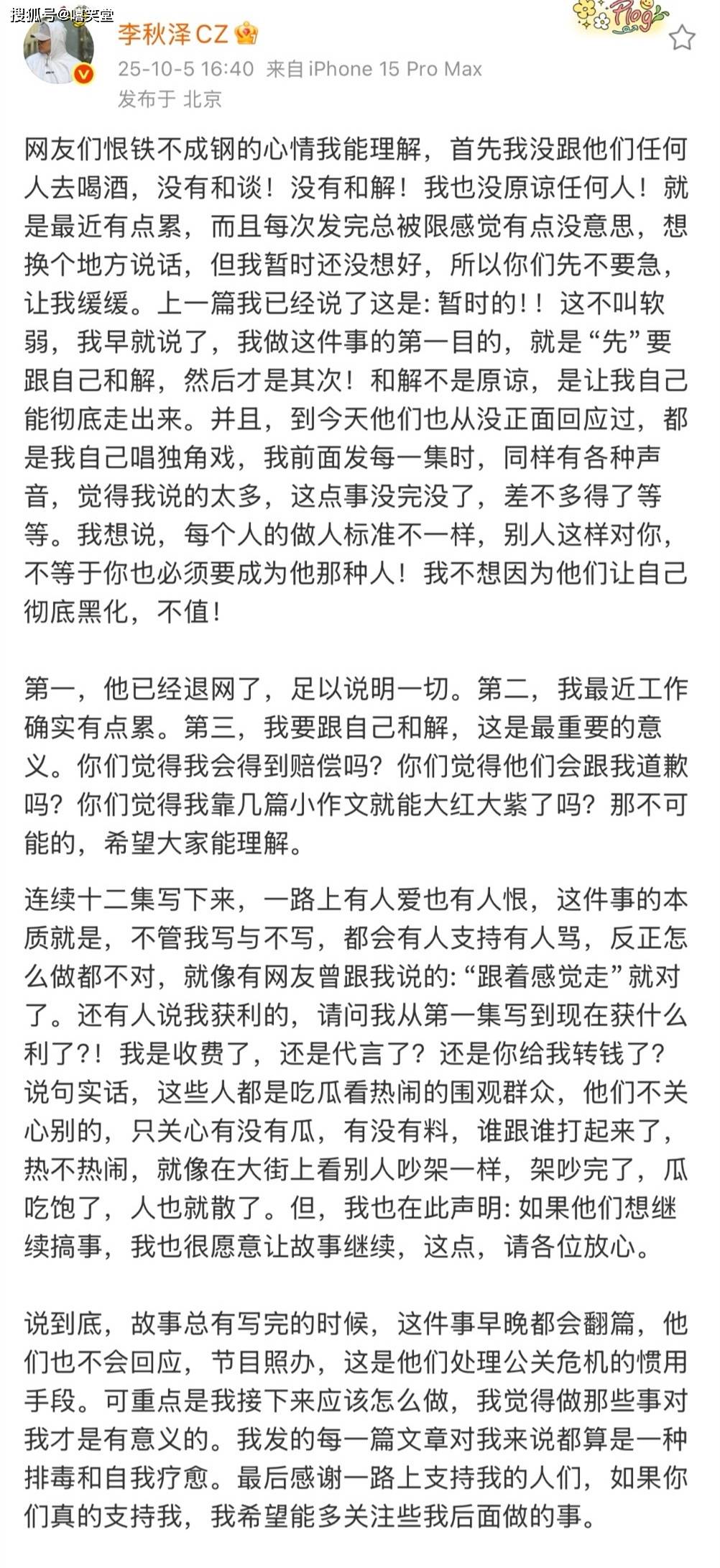 “第一,他已经退网了,足以说明一切。第二,我最近工作确实有点累。第三,我要跟自己和解,这是最重要的意义。你们觉得我会得到赔偿吗?你们觉得他们会跟我道歉吗?你们觉得我靠几篇小作文就能大红大紫了吗?那不可能的,希望大家能理解”