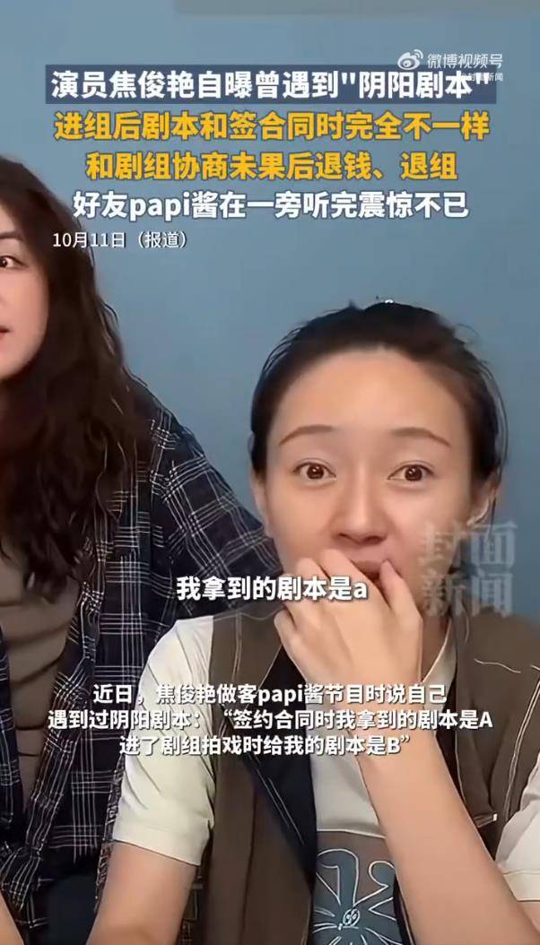 10月11日,有媒体报道,演员焦俊艳在节目中自曝拍摄经历,直接捅破了“阴阳剧本”这层窗户纸——签合同时敲定的是剧本A,进组后竟被偷换成剧本B,故事彻底变样。协商无果后,她直接选择退钱、退组,用行动硬刚行业乱象。