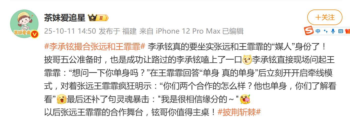 据网友10月11日爆料,《披荆斩棘2025》五公排练现场竟秒变“相亲角”——李承铉偶遇帮唱嘉宾王霏霏,开口直接暴击:“想问一下你单身吗?”得到王霏霏“单身,真的单身”的肯定答复后,他立刻转向一旁的张远,开启牵线模式:“你们两个合作怎么样?他也单身,你们了解看看~”末了还补了句“我就说到这里,剩下的你们自己了解”,并一本正经强调:“我是很相信缘分的。”